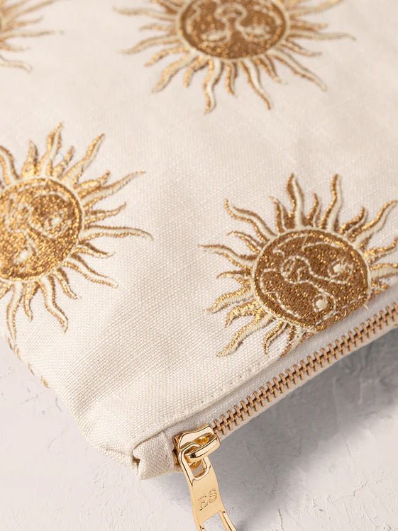Elizabeth’s hand-drawn sun motif is emblazoned onto a soft velvet base, with intricately embroidered gold and vanilla threads. She has depicted the sun with a human-like face, imagining our most powerful star as a character who radiates warmth and life.