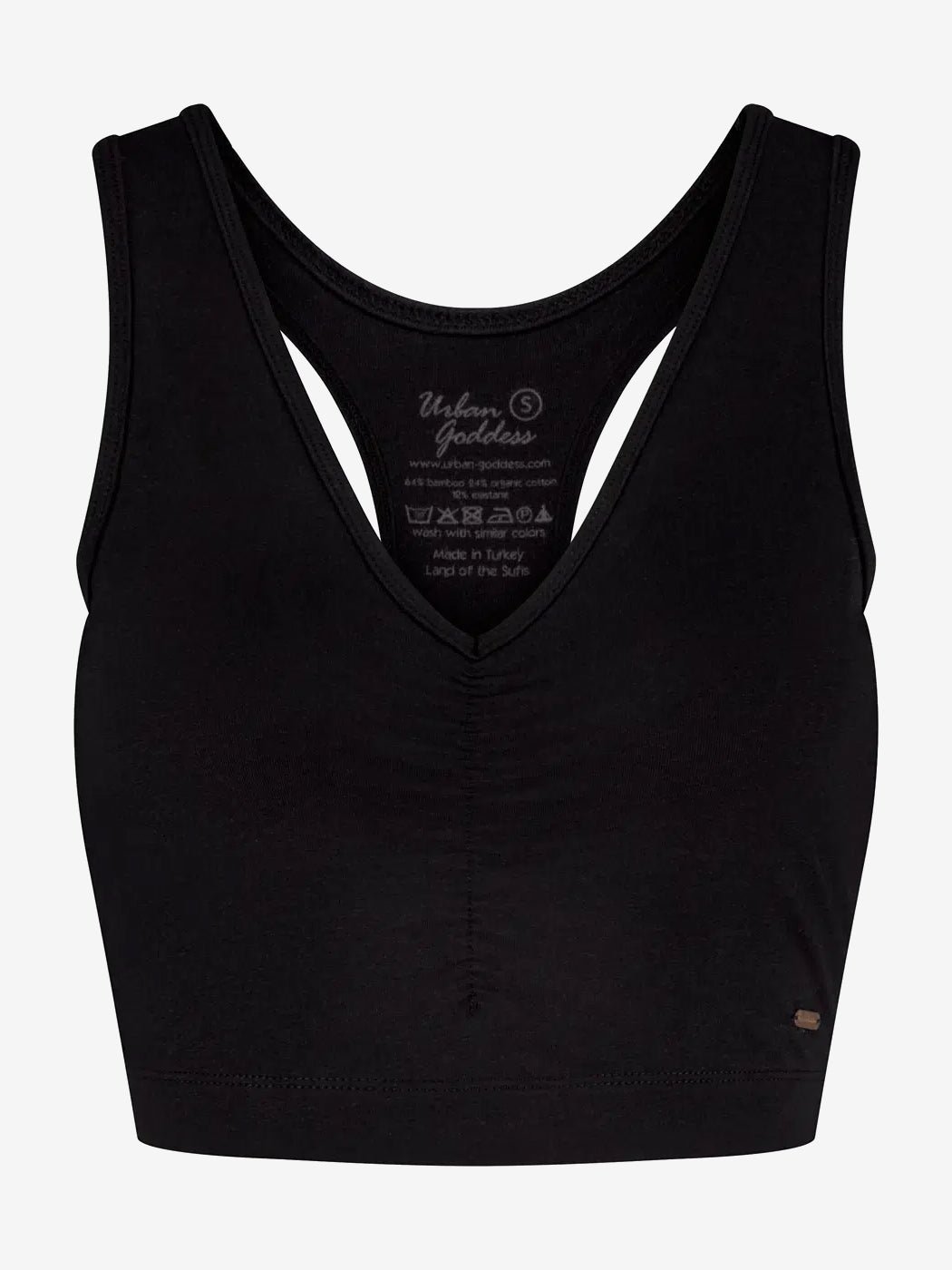 Urban Goddess use only certified organic cotton for their yoga & sportswear. The Anjea bra is OCS (Organic Content Standard) certified. In addition, the bamboo is this bra is Oekotex STeP certified, which is the highest closed loop environmentally friendly and safe variant of bamboo. Urban Goddess produces completely carbon neutral. Also, Urban Goddess yoga apparel is Peta approved vegan, so Urban Goddess is truly sustainable, good for you, good for the planet.Â