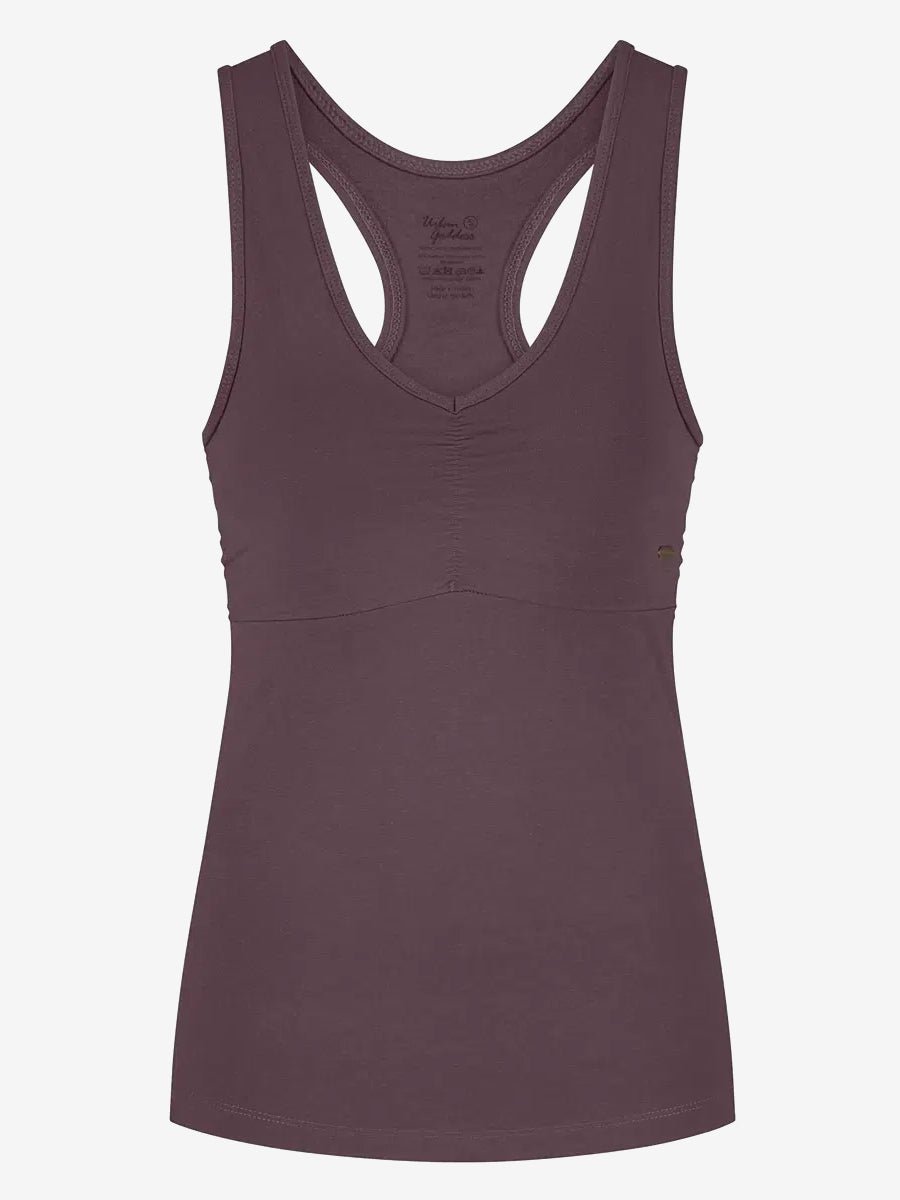 The Anjea Yoga Sports Tank is a workout essential. This sporty yoga top has natural dry-fit features and offers low to medium support with a built in bra.